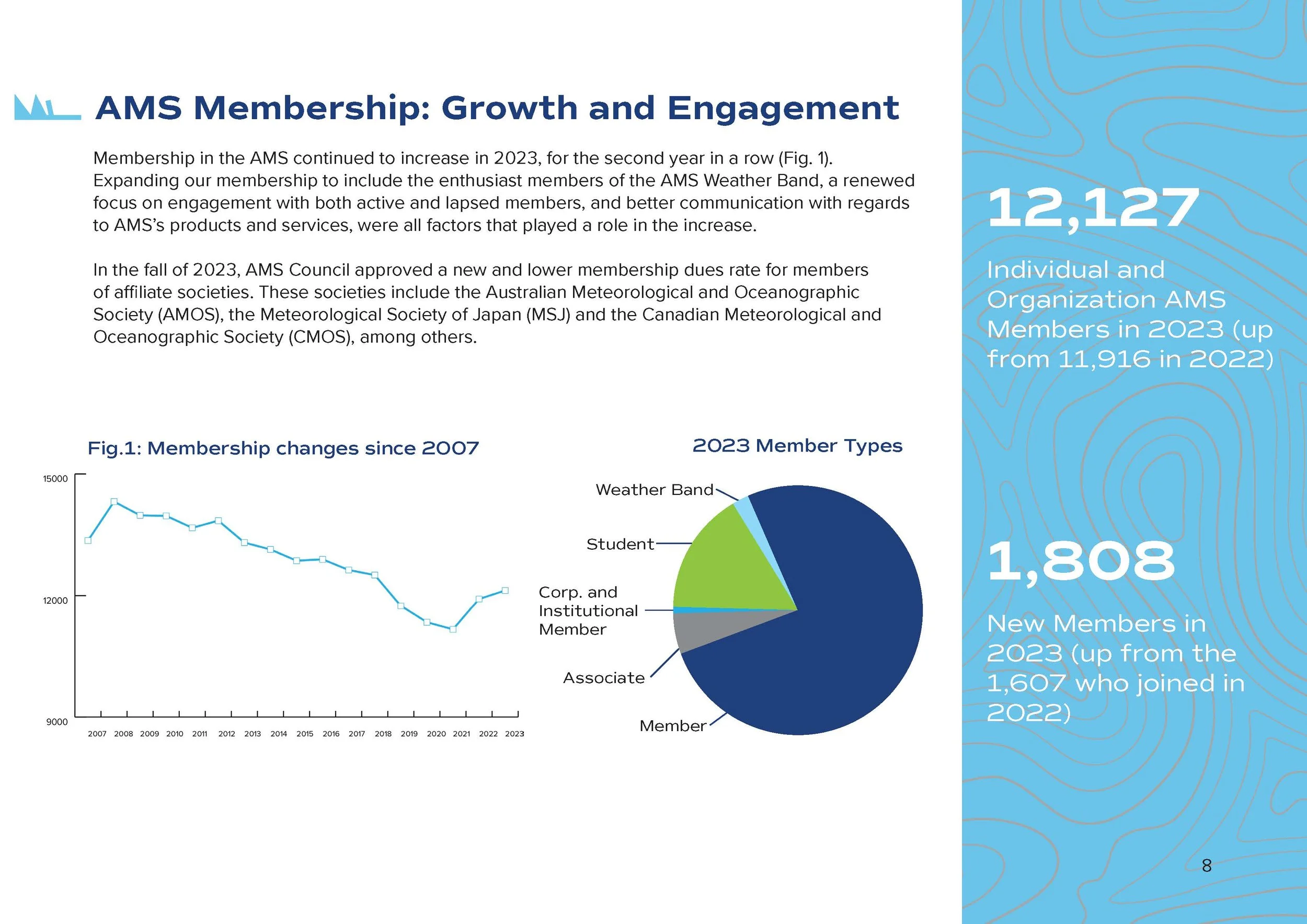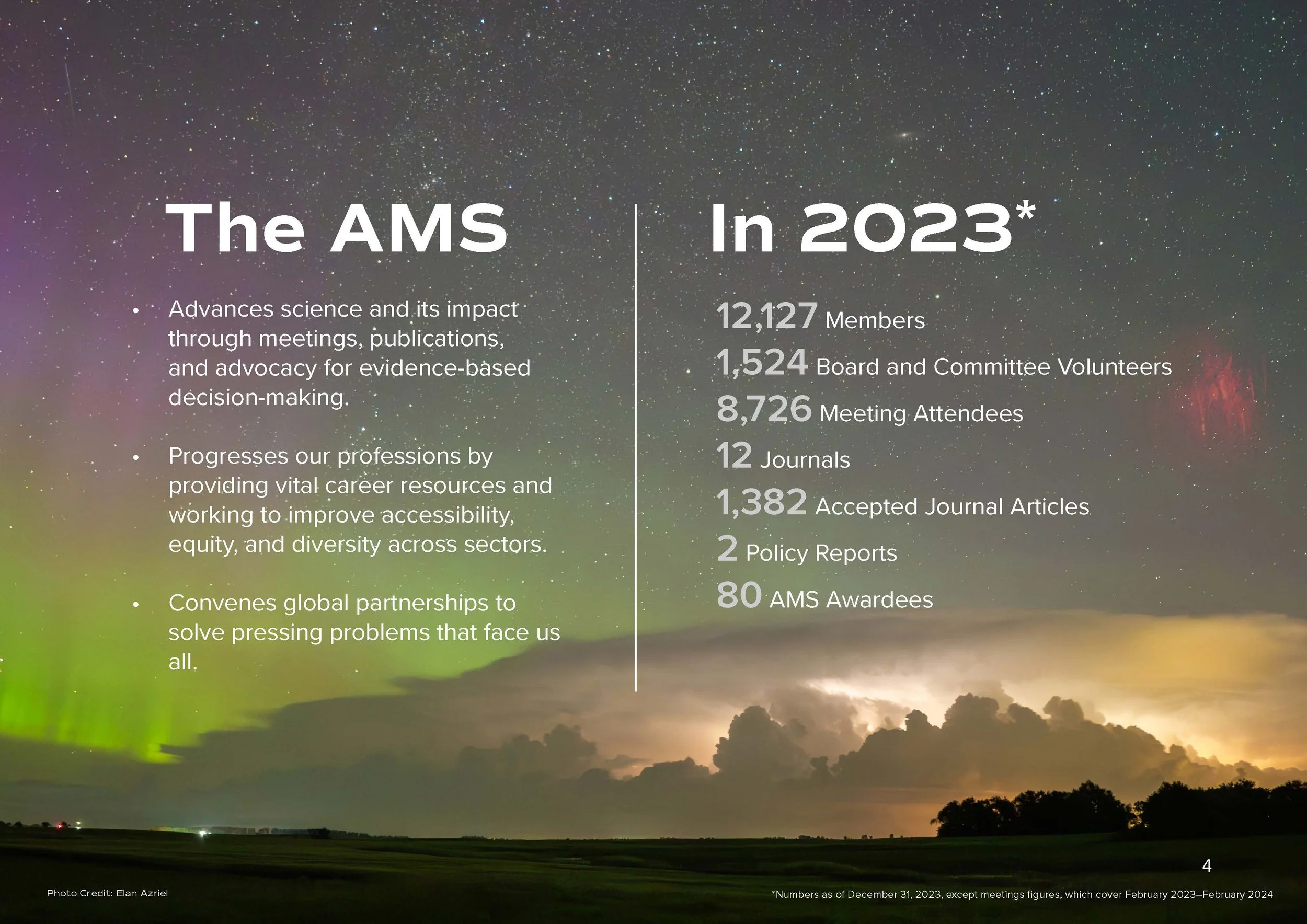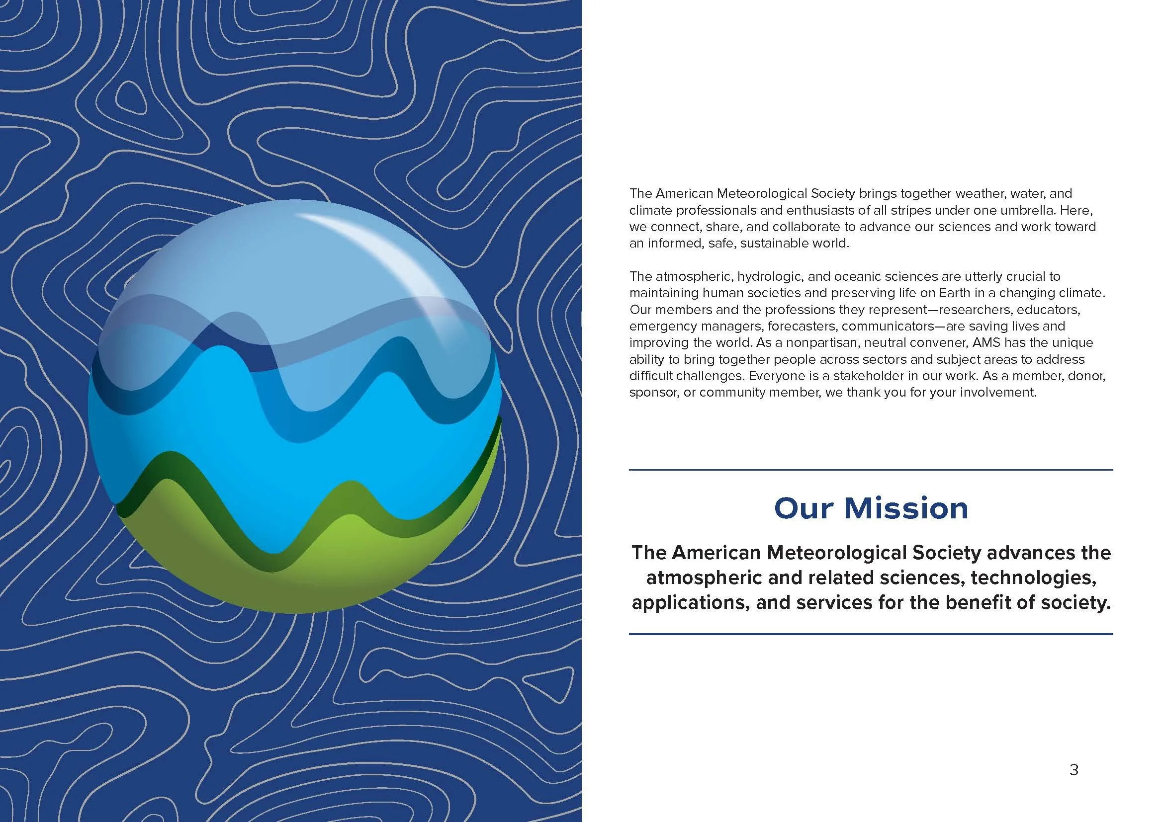 The American Meteorological Society (AMS) brings together weather, water, and climate professionals and enthusiasts of all stripes under one umbrella. Their Annual Report is a yearly document showcasing the organization's impact from the previous year to their members, donors, sponsors and the general public. The goal of this project was to communicate the organizations achievements, future goals, current status, and offer thanks to the generosity of donors and sponsors.