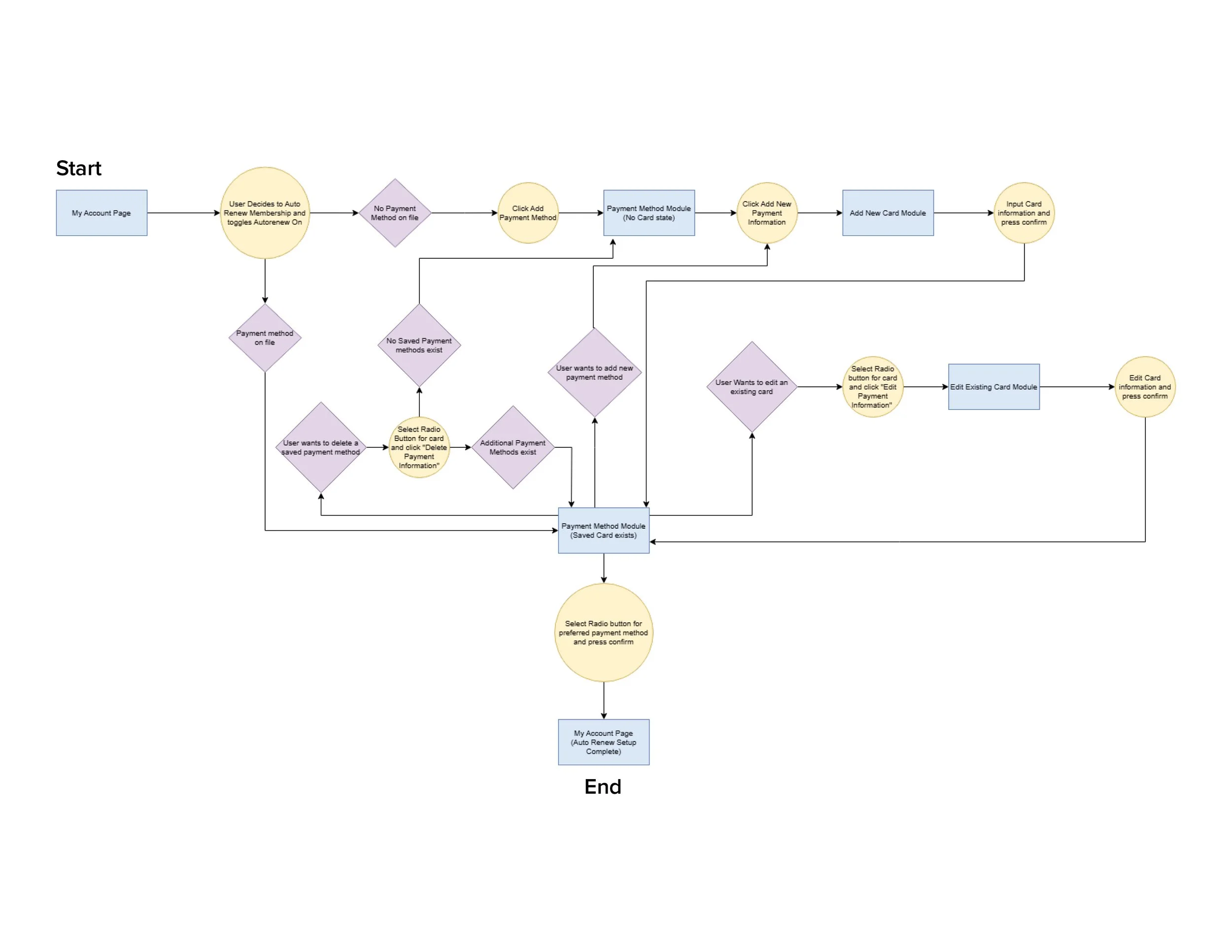 Existing renewal methods did not require the saving of payment methods because a user would essentially go through the join process for a brand new member. This process prompted users for payment information, but had no capability to save this information for future use. With the implementation of auto-renewal, we needed a way for multiple payment methods to be saved and for one to be selected as the default payment method for membership renewal. A "Wallet-like" feature was requested by stakeholders.