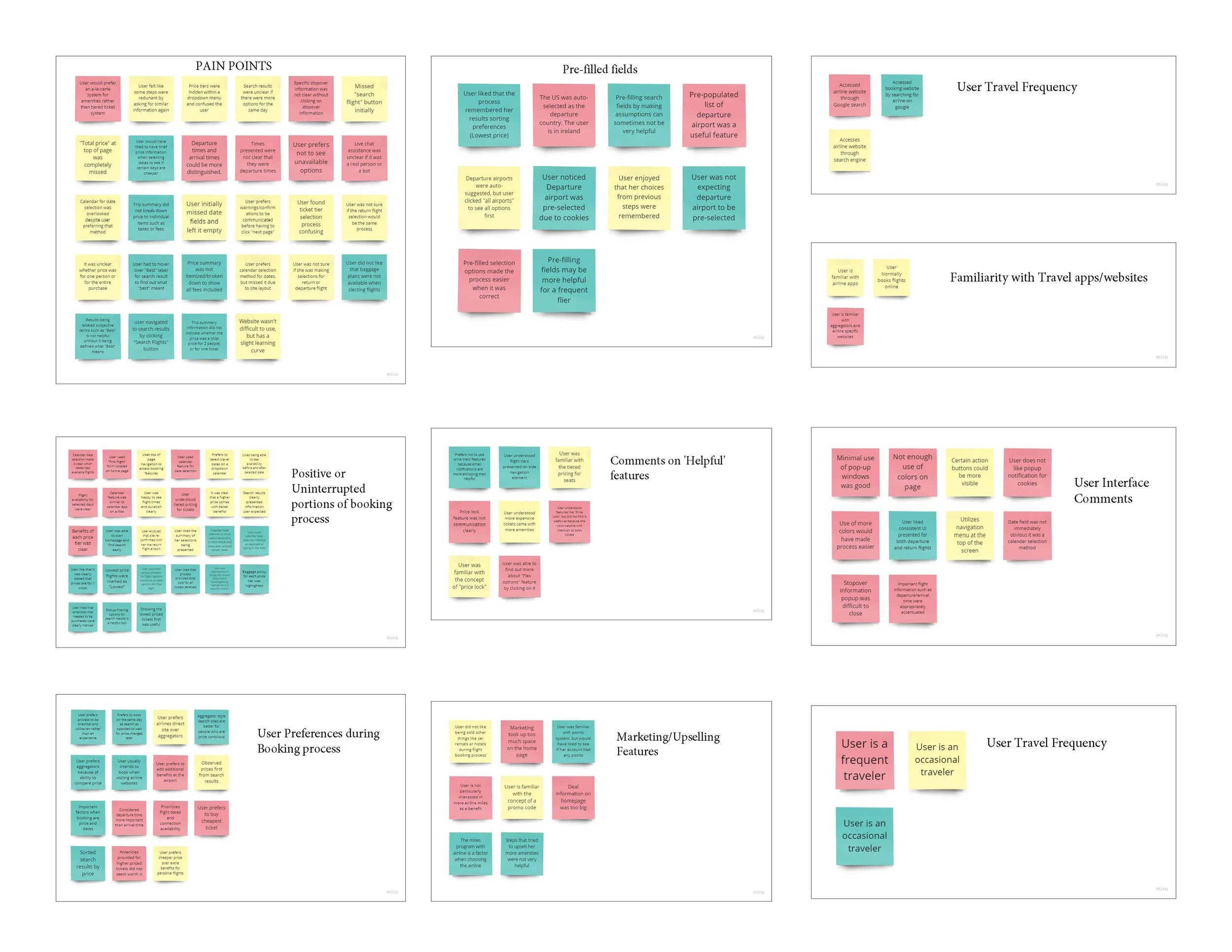 After research was conducted, notes were taken from all of the information collected. This information was used to conduct an online affinity diagram session. This step allows for qualitative information to be grouped into larger themes or concepts that describe the current user experience. These can be concepts such as user goals, behaviors, pain points, mental models, or contextual information.