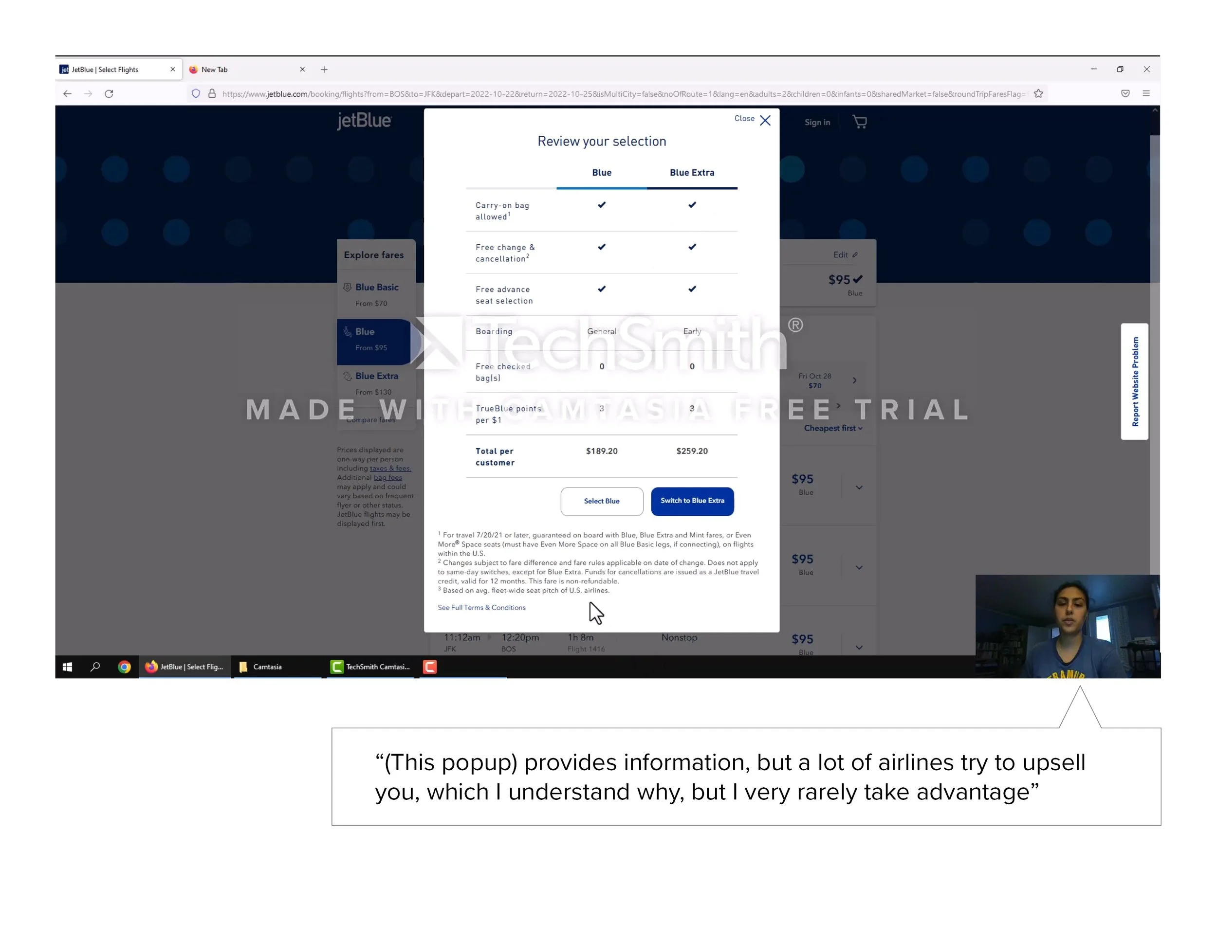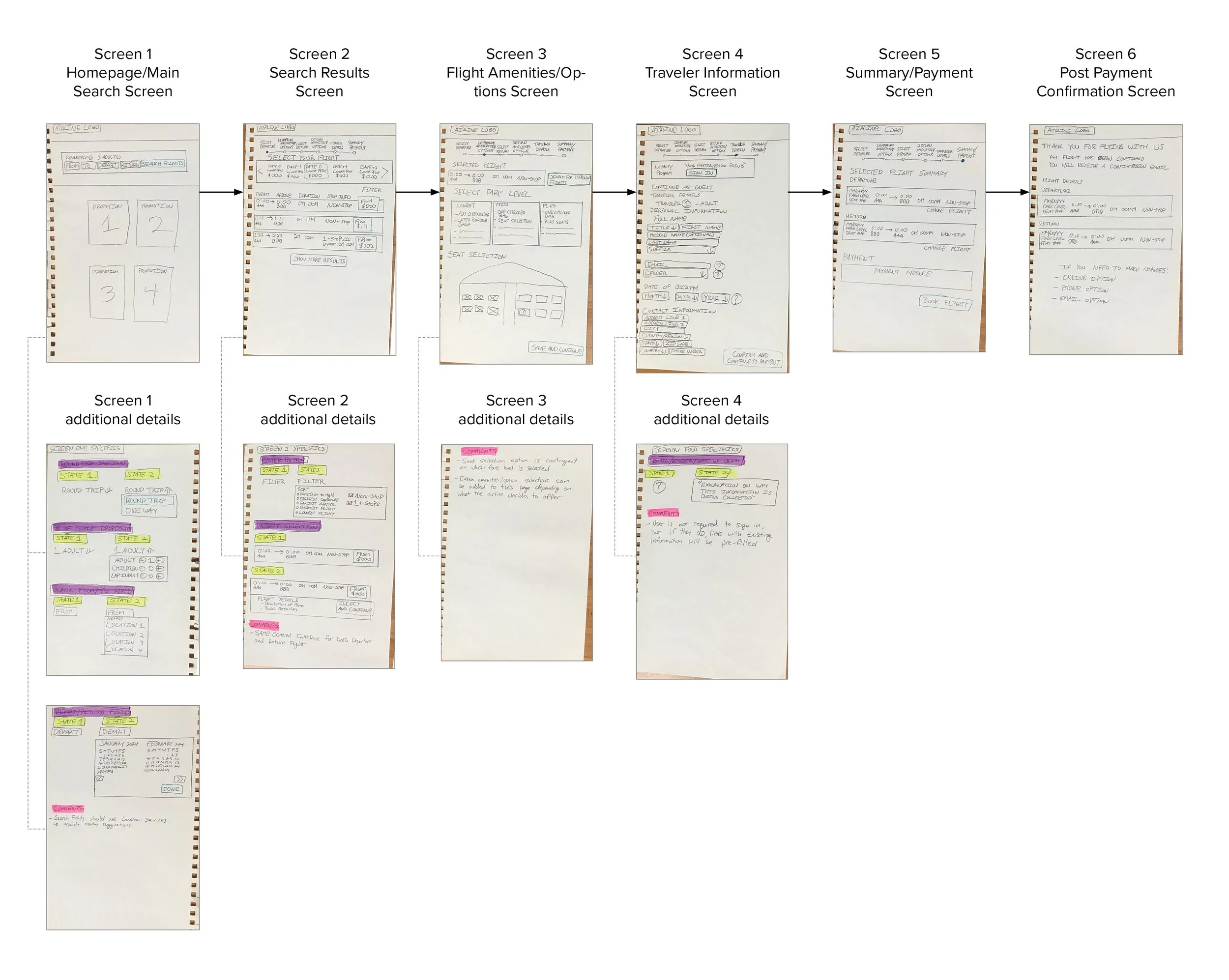 Usability testing was conducted to collect rich insights directly from the user. I moderated a usability test for an airline's booking process (JetBlue) and for a travel aggregator's booking process (SkyScanner). The goal of this test was to learn about the context of use of people that use these websites: What are they trying to do? Who are they with? Where are they? What devices are they using? I also wanted to learn about the goals and behaviors of customers when booking flights.