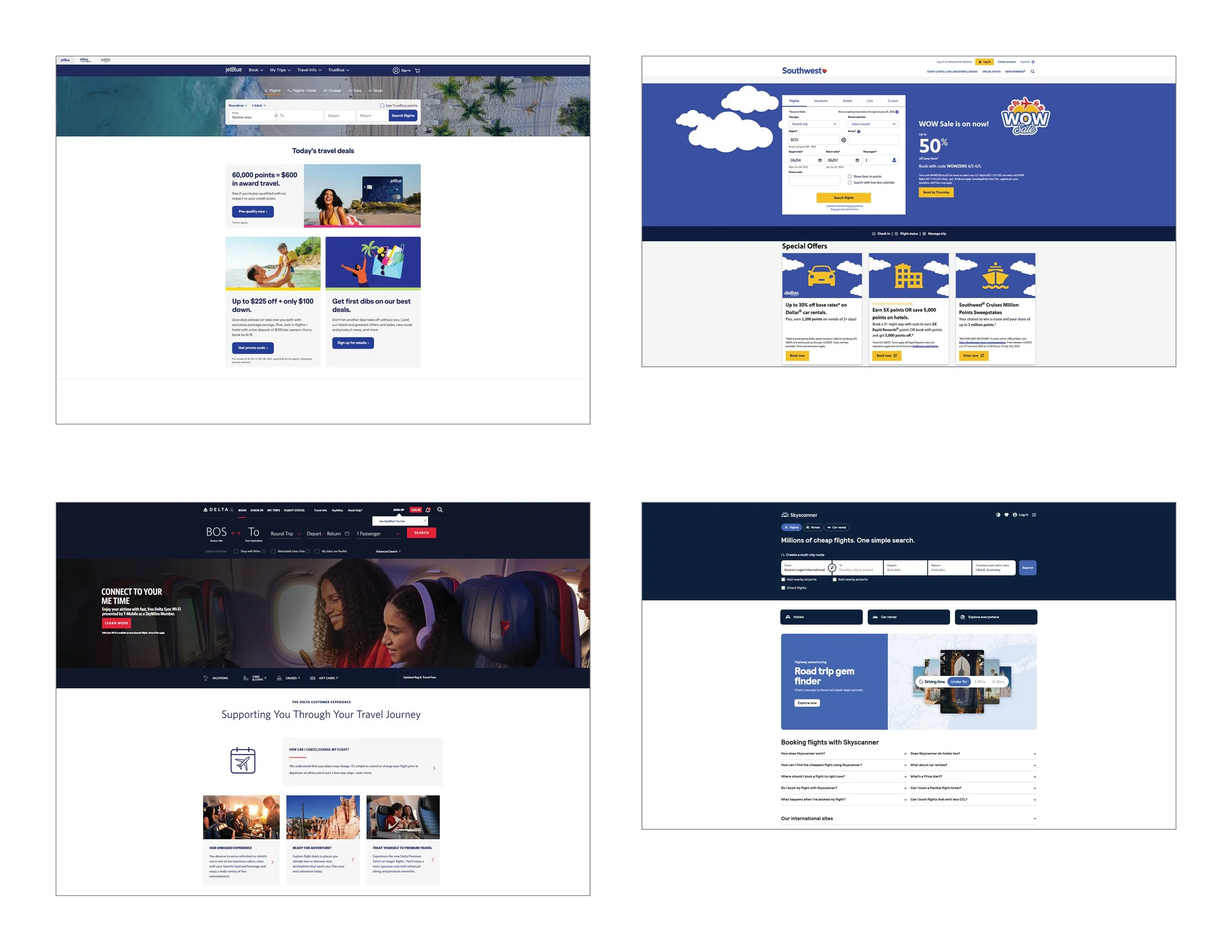 Research was conducted on competitors to identify what they are doing right and learn from aspects that may be less effective. This was an opportunity to identify the conventions to be followed. A focus was placed on the homepage, how user search and select flights, and how users input their personal information.